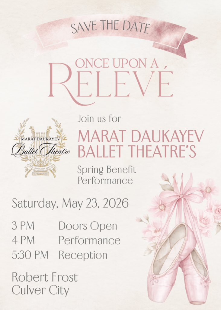 The purpose of the Marat Daukayev Ballet Theatre is to establish and maintain an esteemed hub for ballet excellence and education in Los Angeles. Dedicated to the art of classical ballet, we offer unparalleled training to a diverse community of students through our renowned institution, the Marat Daukayev School of Ballet. Embracing our commitment to inclusivity, we grant scholarships to talented young dancers based on their financial need. Moreover, we extend the joy of live ballet performances to families who might not have had the opportunity otherwise. Our mission is to enrich lives through the magic of ballet and cultivate a world-class legacy of grace, talent, and artistic expression.